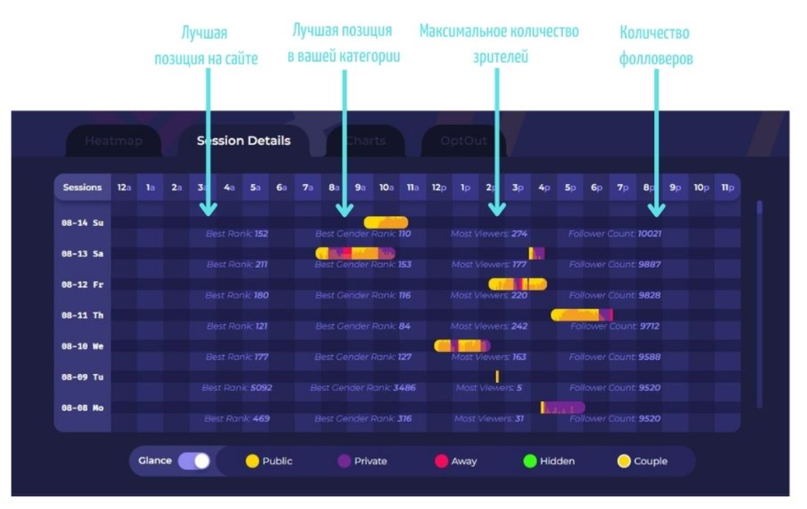 Снизу графика расположены статусы комнаты: фри чат, приват, away, закрытая комната и режим пары. В нижнем левом углу включается функция обзор (glace), она позволяет вам быстро отследить свою лучшую позицию за день.