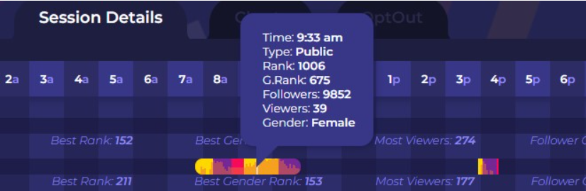 Session Details В этой вкладке по графику можно отследить вашу лучшую позицию на сайте в конкретно вашей категории, а также увидеть максимальное количество пользователей в комнате за определенную смену и рост подписчиков.