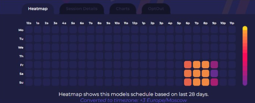 График окрашен от желтого к фиолетовому, где желтый - самое регулярное время трансляции для конкретной модели, а фиолетовый - те часы, когда модель не часто можно застать онлайн. Рассчитывается на основе 28 последних дней. В идеале нужно стремиться к тому, чтобы иметь желтые квадратики в одинаковое время.