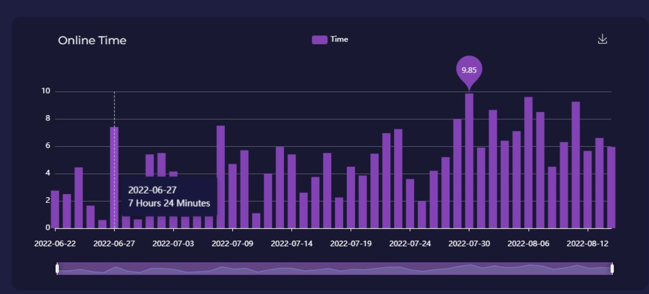 Первая диаграмма позволяет проверить количество часов в онлайн в любой день, а также определить, когда был самый продолжительный стрим.