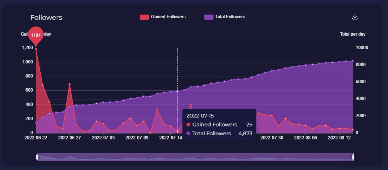 Подписчики. Светло фиолетовая область указывает на рост основного числа фолловеров. Светло розовая область указывает на число новых фоловеров за день.