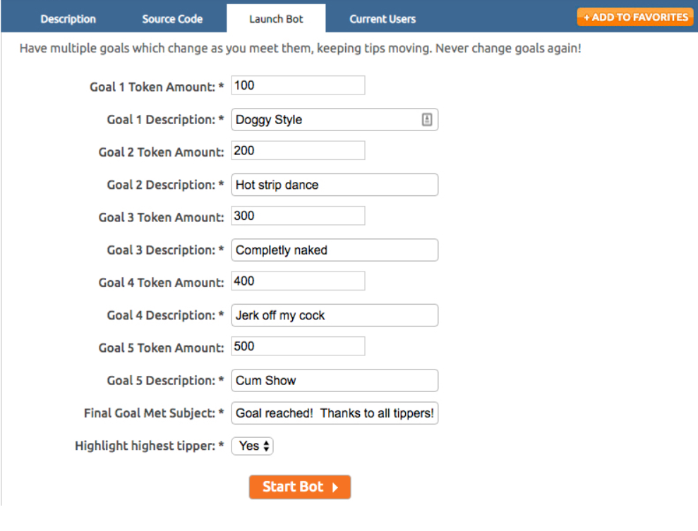 Sequence Tips With Group Tipping нахрен скрывает вашу цель для всех гуманитариев. Вы прописываете название цели, и количество шагов в токенах, которые должны натиповать вам мемберы. Если, к примеру, вы прописываете от 1 токена до 50, это значит что к тому моменту, как мемберы доберутся до 50, вы уже заработаете 1275 tk. Рассчитывается это дерьмо по формуле (50+1)*50/2 =1275. Соответственно, если вы ставите последнюю ступень 100, то считаем как (100+1)*100/2 = 5050. Внезапно! математика в статье про вебкам! не ожидали, собаки? В конкретно это приложение разработано не для самых азартных моделей, здесь вам смогут натиповать каждый уровень несколько людей сразу, но если ты хочешь проверить своих постоянников на прочность - попробуй классическую версию Sequense Tips.