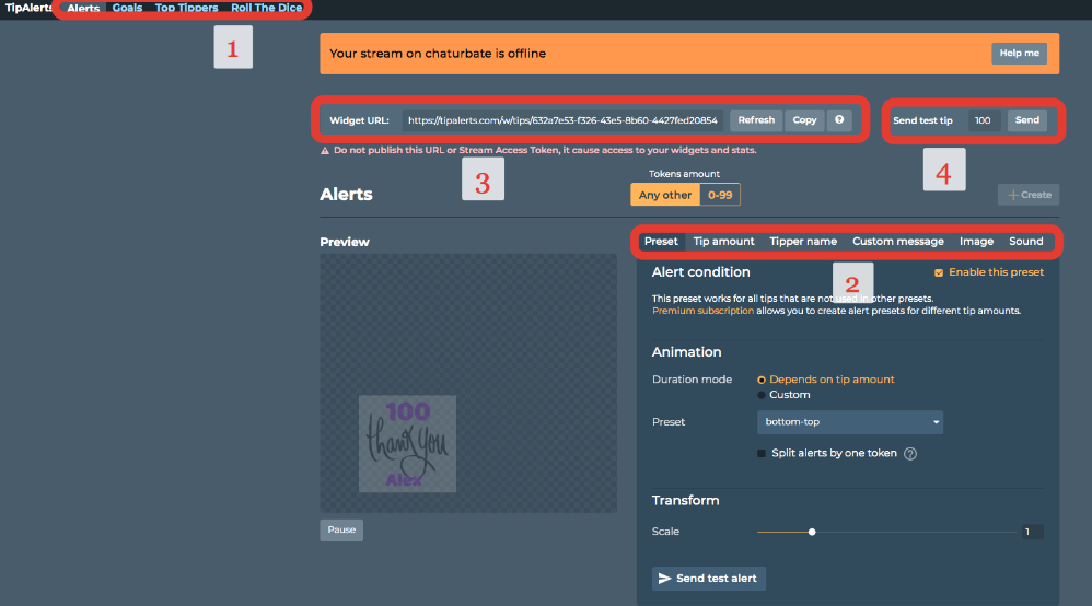 Шаг 5. Проверяем, под номером (4) есть тестовая кнопка Send Tip чтобы проверить как работает программа. Если все хорошо, можно начинать стрим!